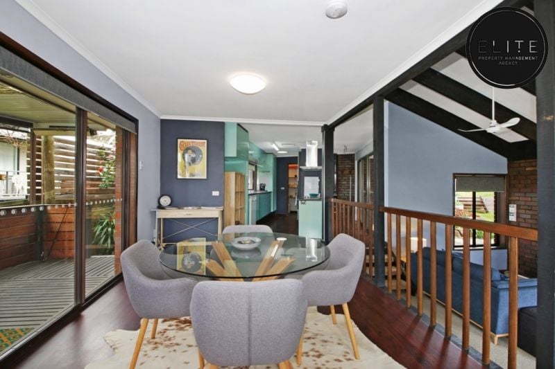 - The higher level dining area features a formal dining table, along with a breakfast-bench seating area also overlooking the lake